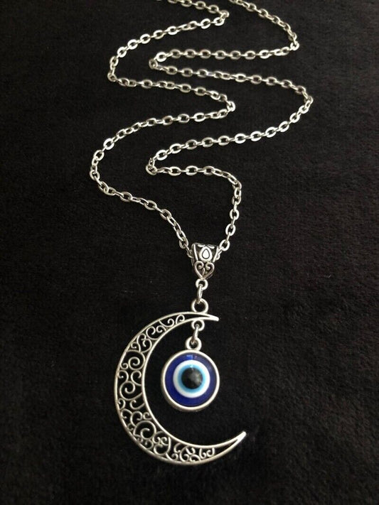 Collana con Ciondolo Luna e occhio Blu Hamsa Pendente color silver