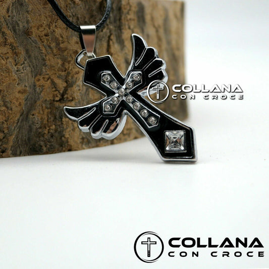 Collana cordino con pendente Ciondolo a Croce con le Ali con Pietre Strass Corda