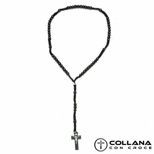 Collana Rosario in legno con perline nero e Crocifisso da Uomo per Donna Croce