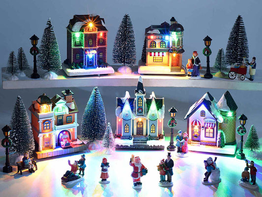 Set Villaggio natalizio componibile da 30 pz in resina con luci Natale 5 Case